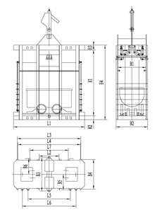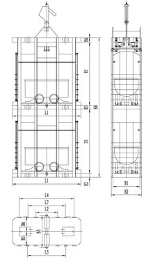 立井單繩罐籠由楔形連接裝置,抓捕器、罐體、罐內(nèi)阻車器、導(dǎo)向裝置組成,如用于上下人,則必須設(shè)置斷繩保險器(防墜器),抓捕器根據(jù)制動繩布置形式可分為I型(對稱)抓捕和II型(對角)抓捕形式。常用單繩罐籠及配套防墜器的具體型號參數(shù)見附表。